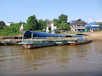 It took maybe half an hour to process our group, ready to cross into Laos. The earlier fog had almost completely burned off, leaving us exposed in the morning sun as we made our way to the ramp and onto the hardened mud banks of the Mekong. A small flotilla of long, narrow boats lined the shore waiting to ferry travellers across the wide, brown river. Adisak lead us down the steep bank. We carefully inched our way down to the boat and the little plank that served as the gang way. Thankfully, our boat had a little canopy that shielded us from the brutal sun. Once we were all aboard, Adisak wished us all a wonderful trip, and left us in the capable hands of Phet, the tour leader for the remainder of our voyage.